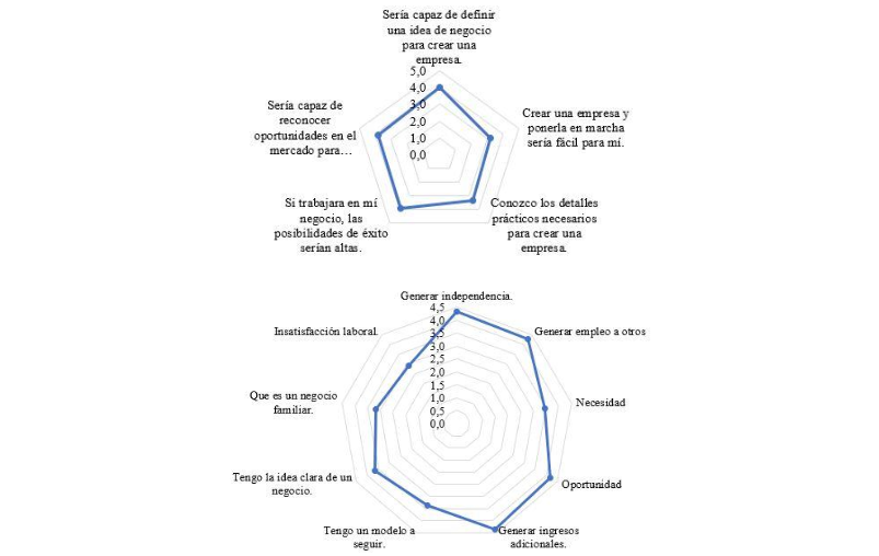 Para el Control Percibido, los encuestados dicen estar en capacidad de iniciar su negocio aprovechando las oportunidades que perciben en el mercado, con una media de respuesta de 4. Sin embargo, con una media de 3,2 en su respuesta, les es indiferente el hecho de que sea fácil o difícil emprender. Por el lado de la motivación, generar independencia es la motivación principal, seguido de poder ayudar con el desempleo actual y la insatisfacción laboral en algún aspecto en su trabajo; además, ven en emprender una manera de tener recursos adicionales a los que perciben en la actualidad. Ver Figura 2.