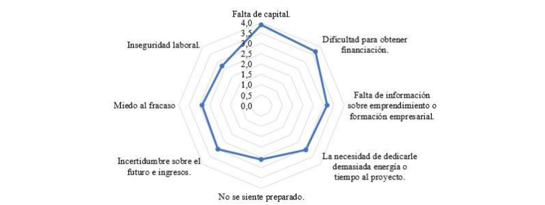 Por último, en la Figura 4, se muestra lo referente al Control Percibido – dificultades / inconvenientes, donde la falta de capital reprime el deseo de emprender, y es manejado como el más alto nivel de dificultad para sacar adelante un emprendimiento, resultado que complementa lo dicho por Elizundia (2015), y que indica que los factores iniciales como el monto de capital, influyen en la intención; la incertidumbre que se genera al tener el negocio propio y las responsabilidades que acarrea, hace que la población considere que existe un alto nivel de inseguridad laboral al enfrentar un panorama como emprendedor ligado, al temor al fracaso, temor al cambio y a lo incierto que puede llegar a ser inicialmente ser dueño de su propio negocio.
