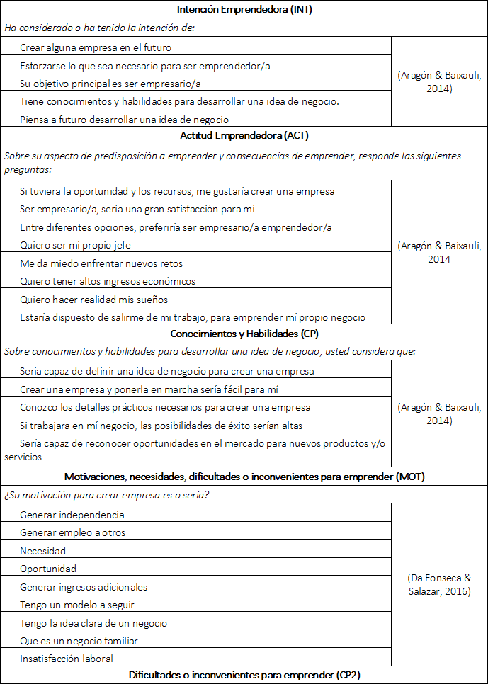 Dado que la Teoría del Comportamiento Planificado constituye una base sólida en la investigación en emprendimiento (Marulanda et al., 2014), y las variables sociopersonales propuestas por Shapero y Brazeal, para esta investigación, el instrumento aplicado se basó en variables correspondientes a los factores planteados en dichas teorías, los cuales son INT= Intención ACT=Actitud CP=Control Percibido NS= Norma subjetiva - Opinión de los demás NSC=Norma Subjetiva-Competencias, empleándose una encuesta con una escala de Likert de cinco posiciones, donde 1 indica «muy bajo», 2 «bajo», 3 «ni muy bajo ni muy alto», 4 «alto», 5 «muy alto», y otra escala donde 1 indica «muy en desacuerdo», 2 «desacuerdo», 3 «neutral», 4 «de acuerdo» y 5 «muy de acuerdo». En el Anexo (Tabla 7), se muestran las variables utilizadas para medir cada factor, adaptadas al contexto estudiado, de manera que se garantizara el entendimiento del instrumento por parte de los individuos encuestados.