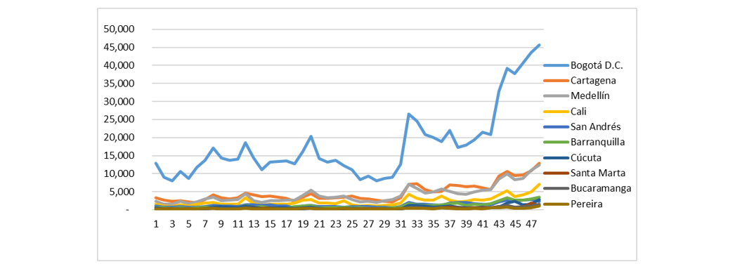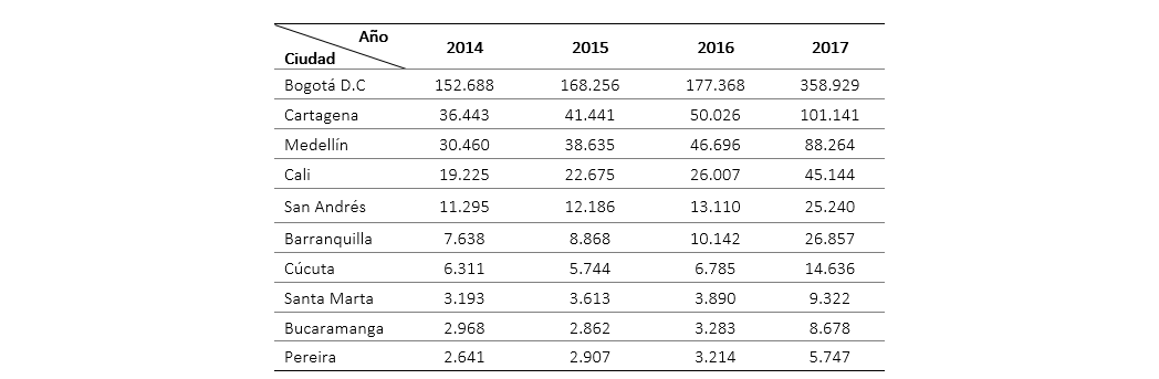 En la Figura 2, se muestran los hallazgos encontrados en el análisis estadístico, que se realizaron a través de la información de los boletines de Migración Colombia, en un intervalo entre enero de 2014 y diciembre de 2017, respectivamente, para un total de 48 datos mensuales, agrupados anualmente. Teniendo en cuenta las 10 principales ciudades receptoras de venezolanos, en el respectivo orden, se tiene: Bogotá, Cartagena, Medellín, Cali, San Andrés, Barranquilla, Cúcuta, Santa Marta, Bucaramanga, Pereira.