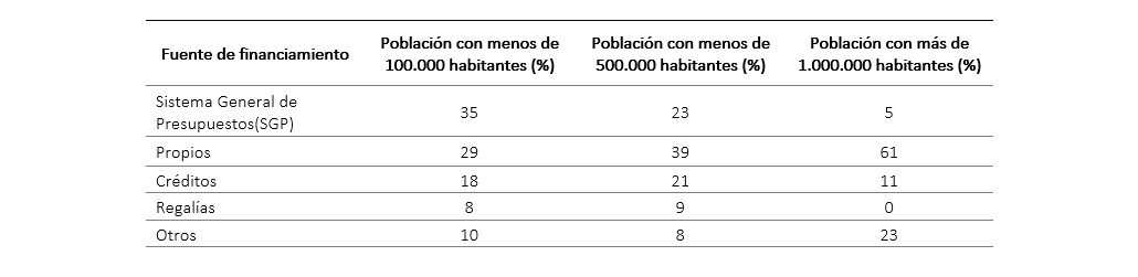 Otro aspecto que contribuye al estudio, dice el DNP, es la disminución de la población y el envejecimiento de la población urbana, lo cual implica cambios en el mercado de trabajo. El 70 % de la fuerza de trabajo calificado en Colombia se concentra en Bogotá, Medellín y Cali. El PIB per cápita en las aglomeraciones urbanas de más de 1.000.000 de personas creció entre el 2002 al 2010 un 3,08 %, en tanto aquellas entre 500.000 a 1.000.000 de habitantes creció un 2,97 %. En casi la totalidad de ciudades se tienen cubierto en un gran porcentaje las necesidades de servicios públicos (agua, saneamiento, energía), pero persiste en forma estructural un déficit de vivienda y se incrementa la urbanización informal o asentamientos subnormales. Los ingresos tributarios para las ciudades en aglomeraciones urbanas crecieron a un ritmo del 4 % y la inversión a un 1,3 % entre de 2000 a 2010. La Tabla 1 denota que las fuentes de financiamiento que tienen los municipios en Colombia dependerá del número de población en cada territorio.