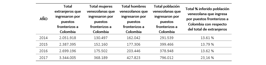 En la tabla 2, se obtuvo información de los extranjeros que entraron a Colombia en un rango de 2014 a 2017, a su vez con inferencia estadística se precisan los venezolanos (hombre- mujeres) que ingresaron al país por puestos fronterizos.