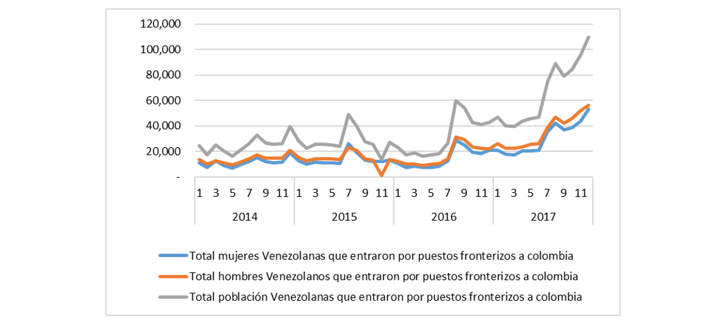 El cálculo se estableció con la información de la fuente, para el total % inferido de la población venezolana que entró por puestos fronterizos a Colombia, con respecto del total de extranjeros, calculándola entre el total extranjeros que entraron por puestos fronterizos a Colombia, divido por la población total venezolana (mujeres – hombres), que llegaron por puestos fronterizos a Colombia, correspondiente a datos mensuales entre 2014 – 2017.