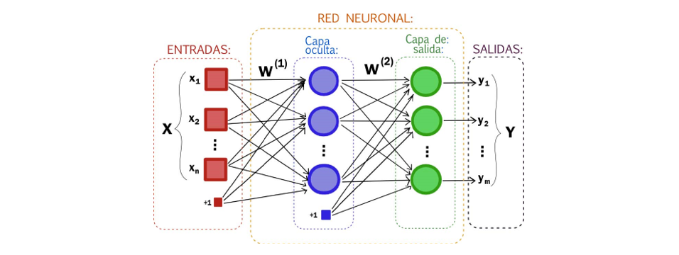 Como se aprecia en la Figura 1, la entrada de la RNA, tiene una conexión de entrada que está asociada a un peso (w), que determina el efecto cuantitativo de unas unidades sobre otras y corresponde a las sinapsis del sistema. Estos pesos se suelen representar con una W_ij^, en que los dos subíndices que indican la neurona (i) que le corresponde y la entrada (j), a dicha neurona a la que están asociados, respectivamente. Por tanto, cada neurona tendrá tantos pesos como entradas.