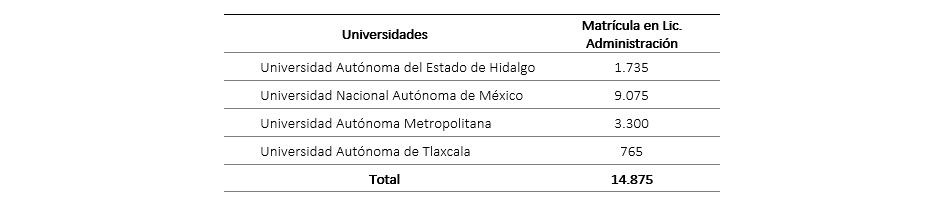 Universidades donde se impartiera la Licenciatura de Administración, en la zona centro de México, las cuales son: UNAM, UAM, UAEH, UAT.