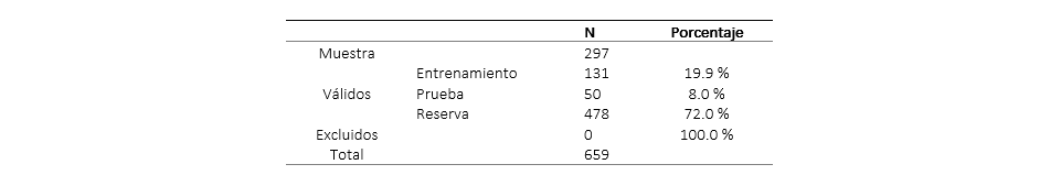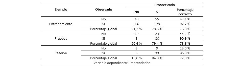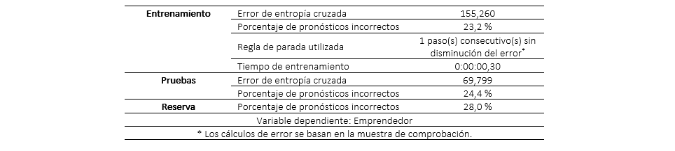 Distintos trabajos plantean la formación empresarial como medio para que los estudiantes inicien su propio negocio, como alternativa para la incorporación exitosa en el mercado (Herman & Stefanescu, 2017), (Hamzah, Yahya, Sarip & Adnan, 2016). Para la contribución en la discusión del tema, posterior al cálculo de los datos, la Tabla 3 muestra el resumen del proceso de los 297 casos de la muestra, para clasificar emprendedor de no emprendedor, en relación con la formación universitaria, para ello se entrena a la red con una muestra denominada de entrenamiento conformada por 131 casos, una muestra de prueba con 50 y una de reserva con 478.