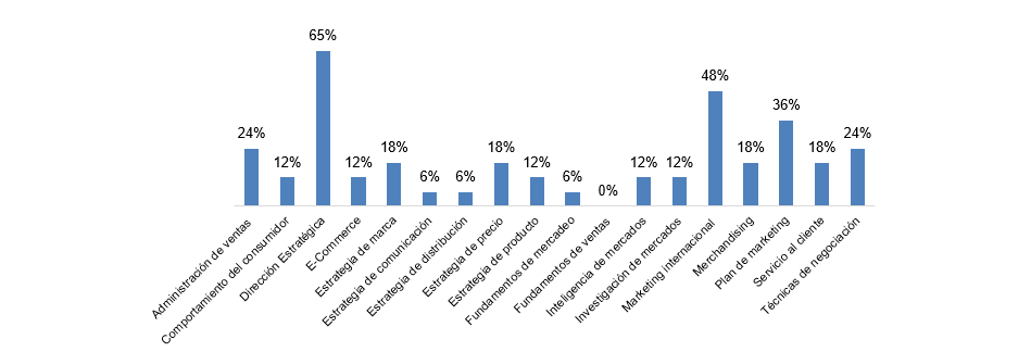 En la encuesta que se realizó a 50 docentes universitarios que dictan cátedra en programas de tecnología en mercadeo, se encuentra que, por ejemplo, en el primer semestre hay una cuasi homogeneidad, en relación con la asignatura fundamentos de mercadeo, con un 83 % de coincidencia, que la asignatura debe ser dictada en el primer semestre del programa; aunque se encuentran casos como el de la asignatura Comportamiento del consumidor, en la cual el 36 % de los docentes consideran que debe dictarse también en el primer semestre.