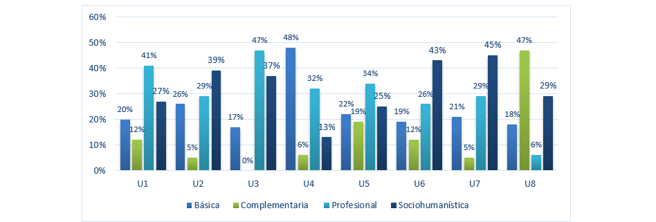 Inicialmente, se hace un comparativo sobre la distribución por áreas de formación. En este se evidenció un equilibrio en cuanto a la participación de las asignaturas por áreas. Se evidencia que el área profesional, que comprende las asignaturas propias de la carrera corresponden al 33 %; las asignaturas de ciencias básicas, son el 25 %; la formación humanista, corresponde al 33 % y las asignaturas complementarias son el 9 %.