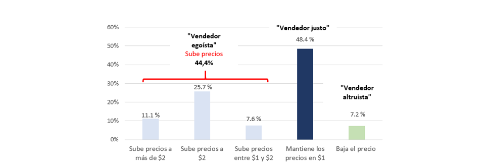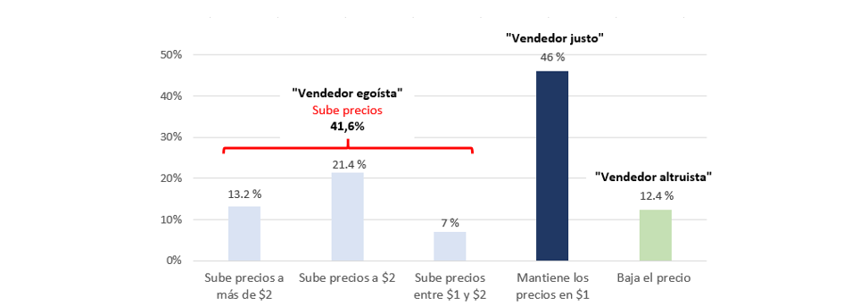 Los resultados del experimento arrojaron algunos matices. En el Grupo 1, el 44,4 % de los que contestaron la pregunta mostraron un comportamiento ‘egoísta’ y anticiparon que subirían los precios. Pero no todos tuvieron una lógica oportunista frente a situaciones de ese tipo, un 7,0 % de los que respondieron la encuesta aseguraron que tendrían un comportamiento altruista y bajarían los precios. Aprovechando las ganancias extras obtenidas en Brasil, ofrecerían mejores condiciones a sus clientes locales. El sentimiento altruista está en muchos individuos que no siempre buscan maximizar sus ganancias permanentemente. Lo mismo sucedió con el 48,5 % restante, que dijo que sostendría los precios en los mismos valores. En resumen, un 55,5 % actuaría de una manera ‘altruista’, manteniendo o bajando los precios.