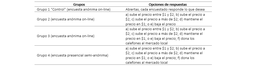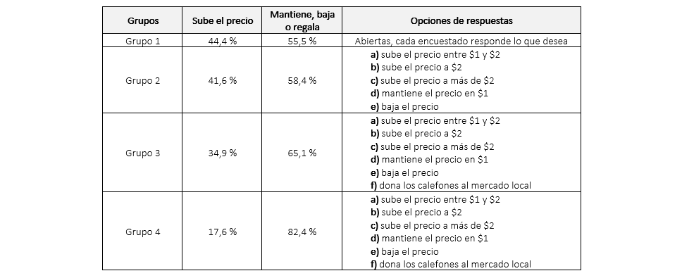 En el Grupo 2 (ver Figura 2), con el mismo tamaño muestra, se le dio opciones cerradas de respuestas: a) sube el precio entre $1 y $2; b) sube el precio a $2; c) sube el precio a más de $2; d) mantiene el precio en $1; o e) baja el precio. En el Grupo 3 (ver Figura 3) se repitió la opción del Grupo 2 sobre otras 500 personas, pero se agregó la opción ‘donaría los calefones en el mercado local’. Una característica de estos tres grupos fue que la encuesta se realizó de manera on-line, y de forma anónima. Así, el encuestado se sentía en la libertad de responder sin la mirada de otro que lo juzgue en sus elecciones. En el Grupo 4 (ver Figura 4), sin embargo, se presentaron las mismas opciones que en el Grupo 3, pero la encuesta se realizó en forma presencial y sobre 250 casos (Ver Tabla 1).