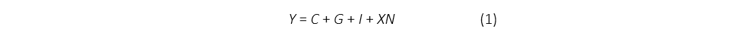 Considerando la contabilidad del gasto, el PIB (Y) se determina a partir del consumo privado de las familias (C), el consumo del gobierno (G), la inversión bruta en capital fijo (I) y la balanza comercial neta (XN), producto de restar la demanda de bienes externos de la demanda de bienes internos por parte del exterior