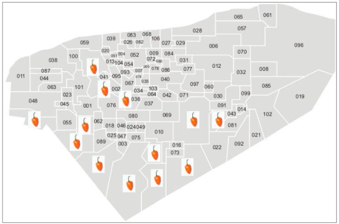 Posteriormente, en la segunda fase del estudio se aplicó la entrevista semiestructurada de enfoque cualitativo, que se dirigió a productores, comercializadores, empresarios industriales y representantes del Gobierno relacionados con la producción de chile habanero en la península de Yucatán. Se entrevistaron veintidós productores localizados en la zona sur del estado de Yucatán, de los municipios de Tekax, Yaxcabá, Tixmeuac, Timucuy y Halacho, dos intermediarios, dos empresarios industriales, un representante de los productores de chile habanero y un funcionario público vinculado con su cultivo. La muestra fue no aleatoria por conveniencia, ya que respondió a dos criterios: el primero fue que los entrevistados participaran activamente en la cadena de comercialización del chile habanero y la segunda su disposición para participar en el estudio de investigación.