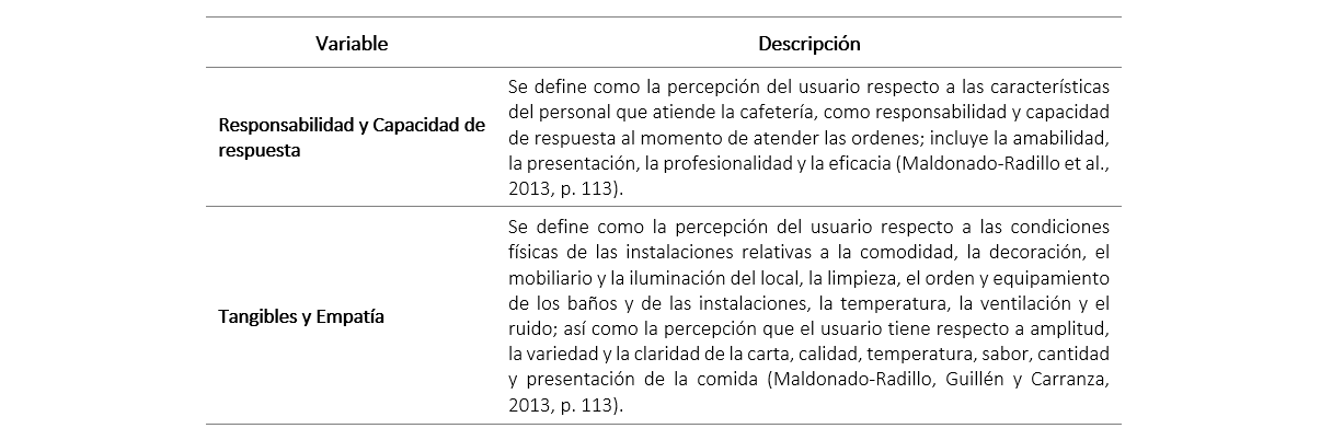 La prueba de adecuación muestral de Kaiser-Meyer-Olkin resultó satisfactoria (KMO = 0.977) y la prueba de esfericidad de Bartlett fue estadísticamente significativa (χ2(300) = 21373.349; p < 0.001). La escala final resultante para evaluar la calidad en el servicio que se percibió incluye dos dimensiones, las cuales explican el 70.999 % de la varianza total. Las escalas resultantes, tras la rotación Varimax con Kaiser, son: Responsabilidad y Capacidad de respuesta (66.424 % de la varianza explicada; 18 ítems) y Tangibles y Empatía (4.576 % de la varianza explicada, siete ítems), las cuales son definidas y mostradas en la tabla 2.
