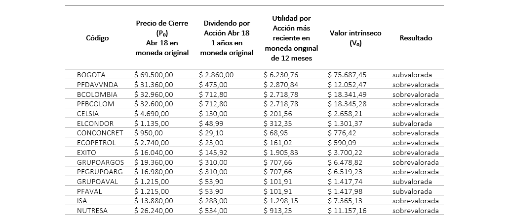 Al calcular para las acciones de Colombia el exceso del valor de mercado con respecto al valor intrínseco, excluyendo la acción CONCONCRET, quien tiene un valor en exceso del 22.4 %, es posible determinar la alta sobrevaloración y el amplio intervalo entre el cual se mueven las empresas sobrevaloradas, las cuales se encuentran entre el 76.4 % para CELSIA y el 364.3 % para ECOPETROL. Por otra parte, la subvaloración no se presenta en grandes cifras ni en un amplio intervalo de distribución, pues la acción más subvalorada es PFAVAL con un 14.3 % y la menos subvalorada es BOGOTA con un 8.2 %; si asumimos que el precio de las acciones es convergente a su valor intrínseco, las oportunidades de inversión por subvaloración, presentan menores expectativas de ganancia que las posibles pérdidas por compra de acciones sobrevaloradas.