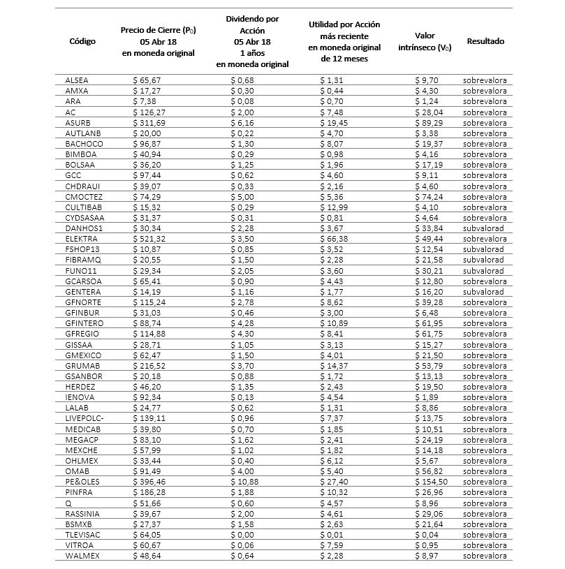 De las 165 empresas en México que reporta el software Economática, 46 pasaron los filtros (ver Tabla 2), realizados los cálculos a través del DDM, el 89.13 % de ellas presenta sobrevaloración.