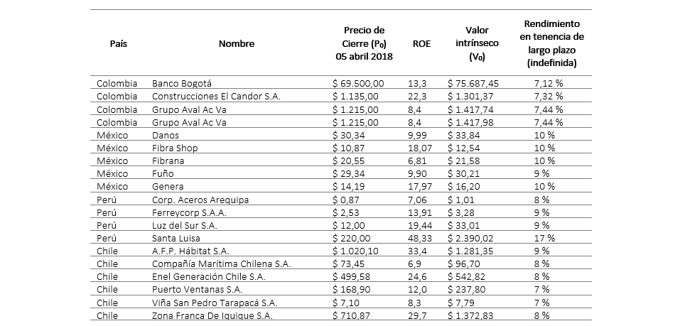 Las empresas subvaloradas en el mercado de renta variable de la Alianza del Pacífico, se relacionan en la Tabla 5.