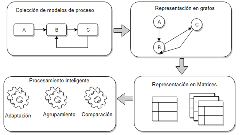 El diseño comprende un sistema de representación de modelos de procesos, un sistema de razonamiento y una arquitectura tecnológica basada en servicios web y agentes de software sensibles al contexto. La Figura 3 presenta el esquema general del sistema de razonamiento. Parte de unas colecciones de modelos de proceso y pasa a traducirlas en grafos dirigidos; haciendo uso de tablas de adyacencia, de pesos y objetos complejos, se realizan actividades como comparación de procesos, identificación de flujos y aplicación de cambios.