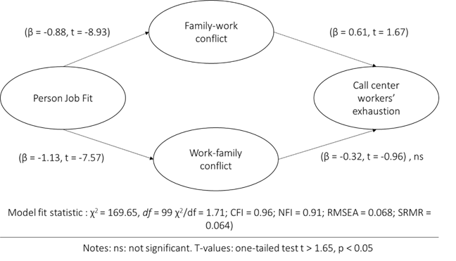 Based on Figure 2 the structural model test yielded good results (χ2 = 169.65, df = 99, χ2/df = 1.71; CFI = 0.96; NFI = 0.91; RMSEA = 0.068; SRMR = 0.064). According to such results, person–job fit has a negative impact on both family–work conflict (β = -0.88, t = -8.93) and work–family conflict (β = -1.33, t = -7.57), which supports hypotheses 1 and 2. Additionally, only family–work conflict shows a positive impact on emotional exhaustion (β = 0.61, t = 1.67), while work–family conflict has no effect on emotional exhaustion among call center workers (β = -0.32, t = -0.96).
