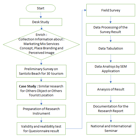 The survey was conducted by a team of researchers at Santolo beach in southern Garut. The instrument used to collect the data was a questionnaire administered to visitors of said beach. The design of the research instrument was based on three research variables: services marketing mix, place branding, and image. The questionnaire was composed of closed-ended questions that were answered using a Likert scale from 1 to 5. In this paper, validity and reliability were supported if the Pearson correlation coefficient was greater than or equal to 0.30 (r ≥ 0.3).
