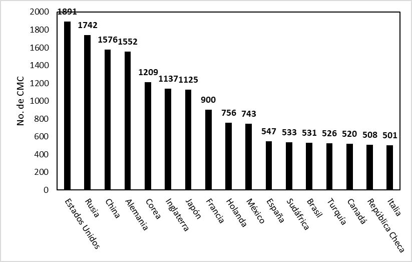 Hasta el primer semestre de 2020, México ocupaba el décimo lugar en el mundo de CMC aceptadas por sus pares internacionales, con un total de 783, de acuerdo con el análisis realizado en la base de datos del BIPM (ver Figura 1). Es importante enfatizar que los países con los LNM más industrializados generalmente son los que ocupan los primeros lugares en el número de CMC declaradas, como Estados Unidos, Alemania, Inglaterra, Francia, Japón, China etc. Sin embargo, un país industrializado como Canadá se encuentra en una posición relativamente baja, posición número 15, respecto a sus pares industrializados (ver Figura 1). No todos los países Latinoamericanos firmantes del MRA tienen una gran actividad para declarar CMC; México, Brasil y Argentina ocupan los tres primeros lugares, respectivamente, en la región. Sin embargo, a Brasil ocupa en el mundo el 13 lugar, y Argentina la posición número 28, por lo que no aparece en la gráfica correspondiente (ver Figura1).