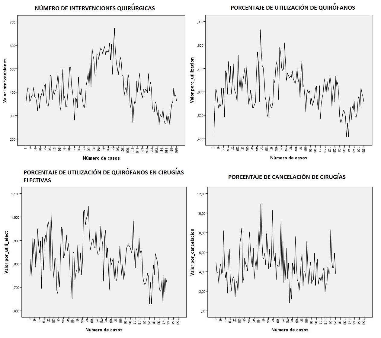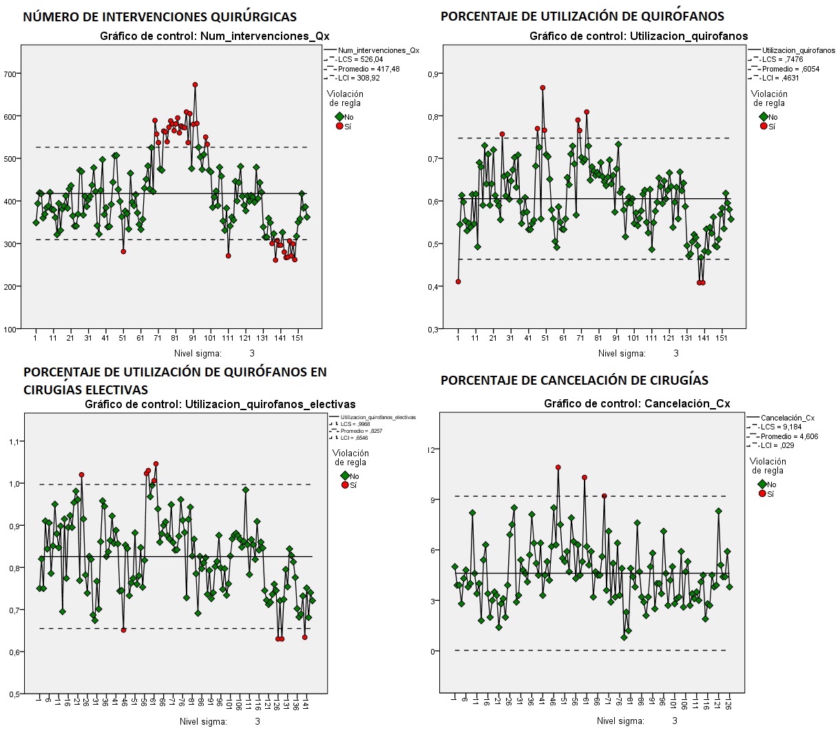 Por último, es importante resaltar que los indicadores analizados sugieren una lectura especial dentro de su contexto hospitalario, en consecuencia, el control debe ser interpretado desde diversas perspectivas, de tal modo que encontrar puntos fuera del límite de control superior no es necesariamente malo, ya que esto indica una utilización o cantidad de intervenciones óptima del servicio, lo que conlleva, asimismo, a plantear estrategias que impulsen estos factores de crecimiento en el número de intervenciones quirúrgicas o utilización de los quirófanos. Por otro lado, puntos por debajo de su línea de control implicaría subutilización del servicio, aunque para el indicador de cancelaciones, el valor óptimo sería idealmente cero.