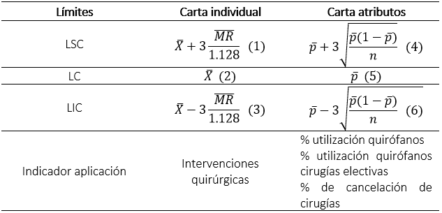 Comúnmente, las cartas de control grafican las observaciones de un fenómeno y determinan su variabilidad. En este caso, los datos de los indicadores para el área de cirugía fueron monitoreados a través de cartas de control individuales y atributos, los cuales consisten en evaluar cada uno de los datos de manera mensual incluyendo tres límites de control calculados, que son el límite central (LC), el límite superior de control (LSC) y el límite inferior de control (LIC). Estos límites de control son establecidos hasta ±3 desviaciones estándar del LC, por lo tanto, los límites establecidos son los presentados en la Tabla 3, donde, las ecuaciones (1), (2) y (3) presentan la carta individual (