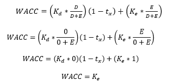 (8)Una vez analizadas las Ecuaciones (2) y (7) se procede a verificar los resultados de la Ecuación 1, recordando que la deuda es igual a cero, y que el rendimiento esperado por los inversionistas es constante, con lo cual se obtienen los siguientes resultados (9).