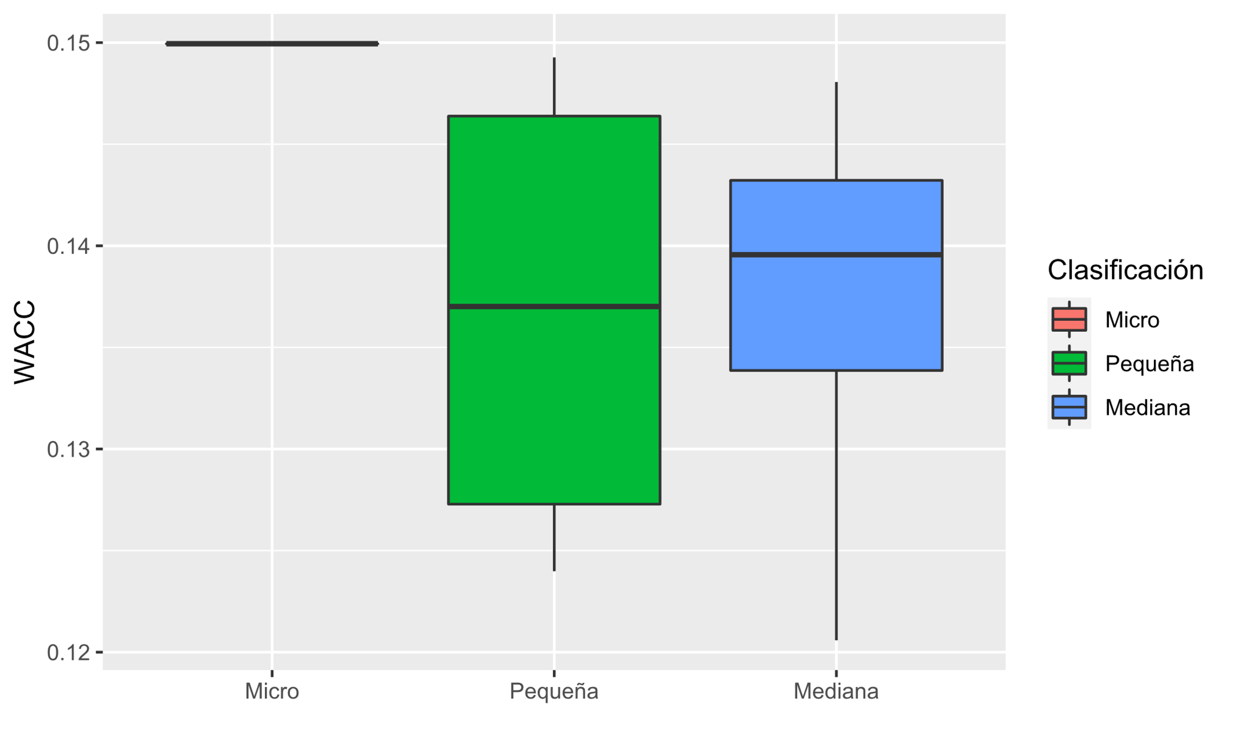 Respecto a la clasificación, la muestra consta de 51 empresas de las cuales el 47.05 % son microempresas, el 27.45 % son pequeñas empresas y el restante, 25.5 %, son medianas empresas. De igual manera, la microempresa, al no contar con deuda en su estructura de capital, hace que su WACC sea constante y que le sea indiferente el costo de la deuda lo que conlleva a la creación de sesgos en las variables involucradas en el modelo estimado. Esta característica hace que el modelo presente dificultades en el cumplimiento de sus supuestos; en esa medida, se excluyeron las microempresas en su estimación.