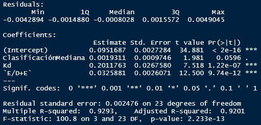 El análisis descriptivo desarrollado previamente permitió establecer un primer contacto con los datos, descartando, inicialmente, la presencia de datos faltantes, outliers, problemas de unidades, entre otros. Asimismo, se logró descartar la microempresa como variable predictora al mantener un valor WACC constante; también se identificó la distribución de las variables involucradas con el fin de establecer posibles transformaciones para el cumplimiento de los supuestos del modelo. Los parámetros del modelo se estimaron con el programa R Statistics 4.0.0 a partir del método de «mínimos cuadrados ordinarios» (el mejor método de estimación siempre y cuando los errores no estén correlacionados y tengan la misma varianza) (