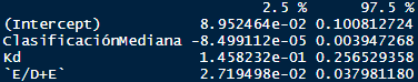 Los resultados muestran que el modelo obtenido estará compuesto por tres covariables más el intercepto, es decir, costo de capital, la clasificación de la mediana empresa (variable dummy [toma valores 0 y 1, si su valor es cero se hace referencia a una empresa clasificada como pequeña; por el contrario, si el valor es 1 se hace referencia a una empresa mediana]), el porcentaje de equity dentro de la estructura financiera y el intercepto. Es importante que el porcentaje de deuda dentro de la estructura financiera implícitamente esté anidada en el porcentaje de equity, ya que es un complemento de esta, de ahí que no se incluyera en el modelo. Con el fin de establecer mejor claridad frente a la estimación de los parámetros se calcularon adicionalmente sus intervalos de confianza. Ver Figura 5.