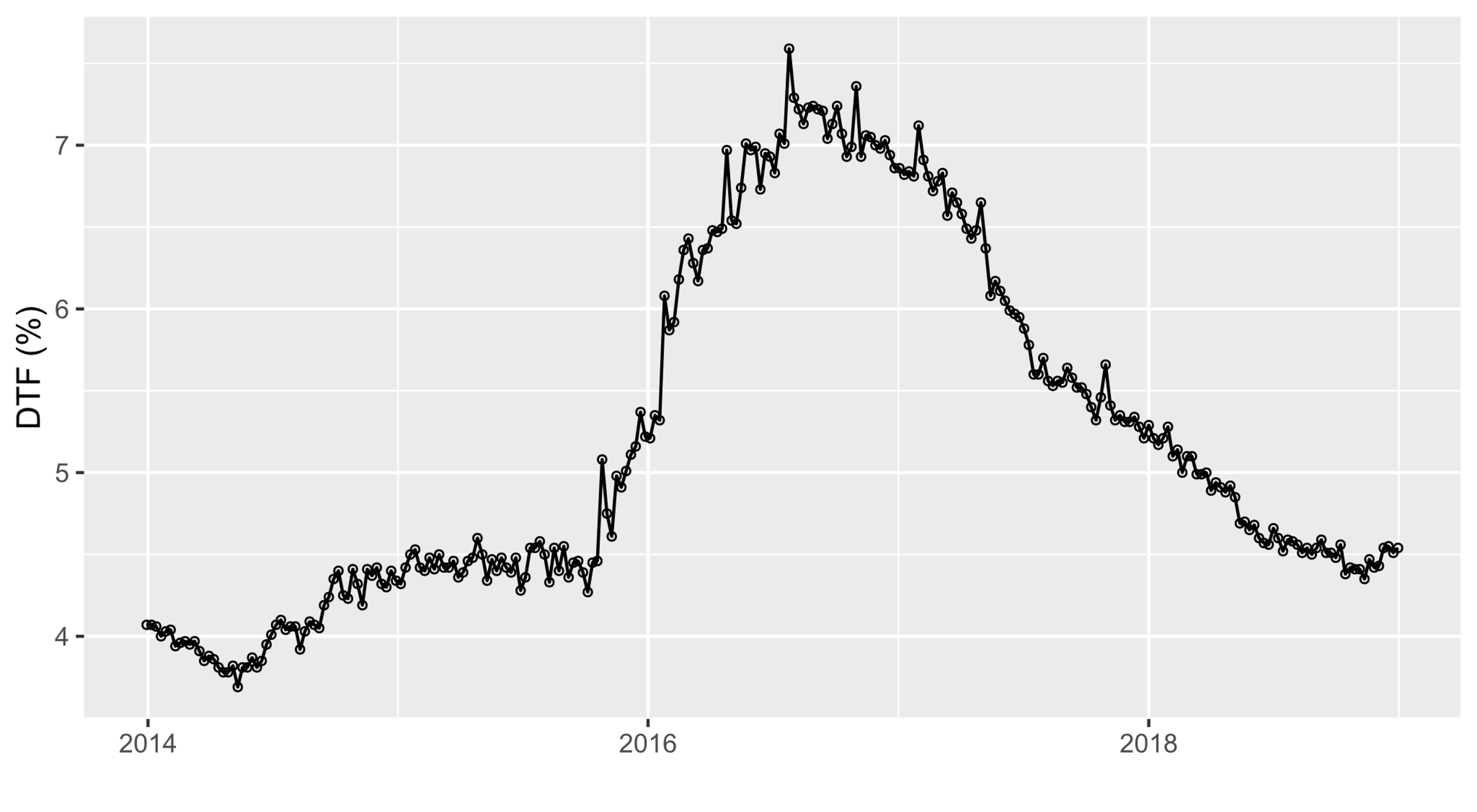 La Figura 6 muestra que la tendencia decreciente del DTF parece haber llegado a su fin, se espera que no se avecine un cambio drástico de tendencia, por lo tanto, se tomará el valor del DTF representado en el tercer cuantil igual al 6.155 %.