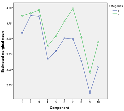 Wilks' Lambda was the contrast statistic used to verify if there were significant differences between the groups, yielding a value of .464 (F = 17.679; gl of the hypothesis = 9; gl of the error = 138; sig. = .000). With this result, it is reasonable to continue the analyses in order to establish where the difference lies. Figure 2 illustrates the estimated marginal means for each of the ten components of the competitiveness index. As can be seen, companies with more time in the market have a higher marginal mean than those with less time in the market, which, according to the classification of the GEM project, corresponds to the category of established entrepreneurs with an activity of more than 42 months paying salaries.