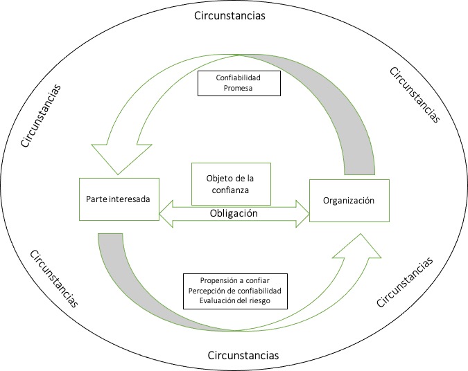 En suma, la confianza en las organizaciones se da en una relación circular, como puede verse en la Figura 1, donde la parte interesada, dada su propensión a confiar, evalúa los riesgos del acto de confiar de acuerdo con la confiabilidad percibida de la organización, la cual, a su vez, refleja esa confiabilidad y la funda en sus promesas explícitas o implícitas, lo que se convierte en un lazo, en una obligación, donde ambas partes tienen poder.