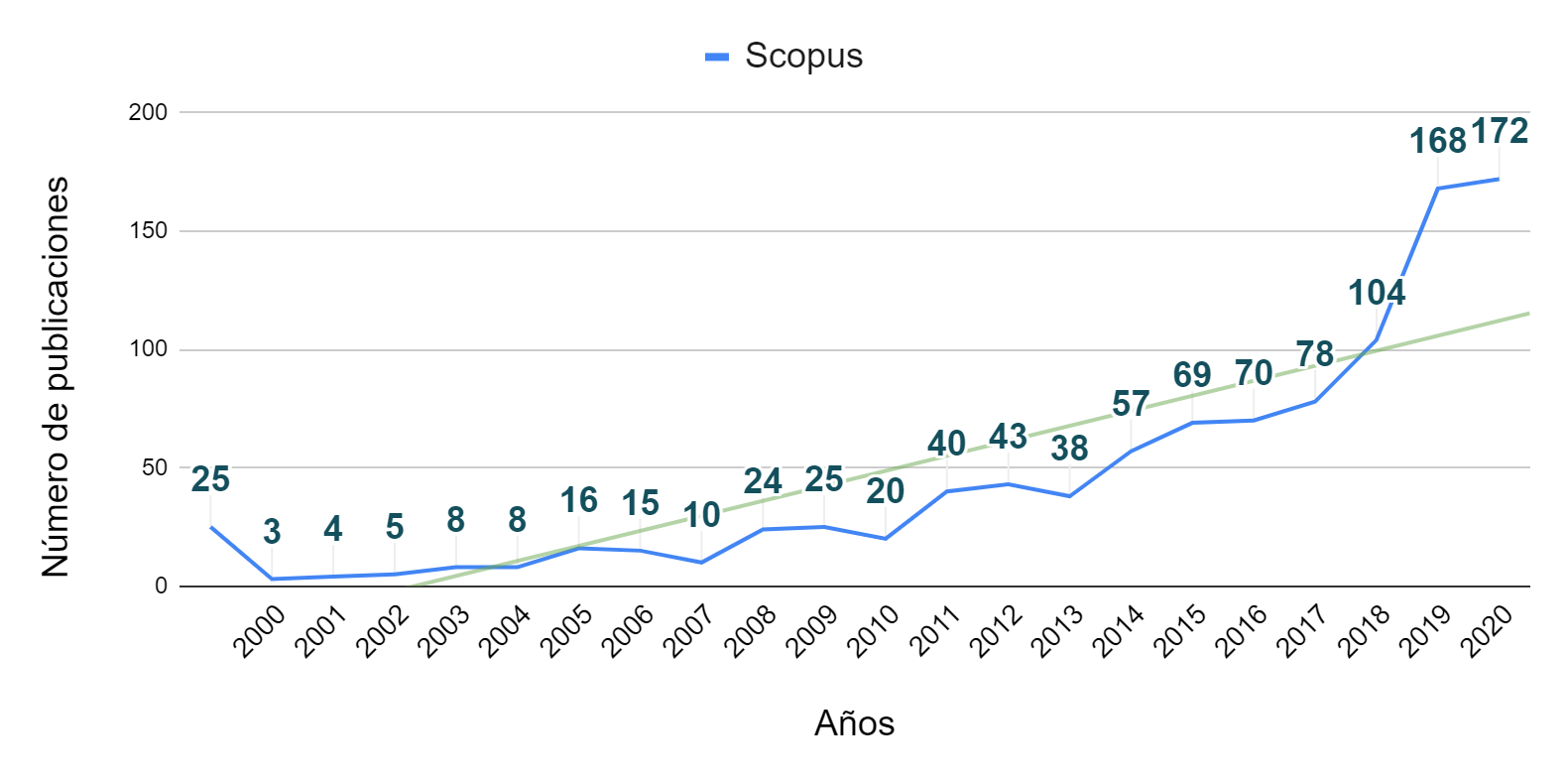 Con el objetivo de exponer la evolución de la producción científica en la temática, se realizó un sondeo del número de publicaciones registradas entre el año 2000 y 2020. En la Figura 1 se puede observar que, en los primeros años del siglo XXI, las publicaciones realizadas eran relativamente pocas, sin embargo, para los finales de la segunda década del nuevo milenio, se empieza a incrementar el interés por parte de los investigadores, siendo los periodos 2018, 2019 y 2020 los más relevantes en número de publicaciones a la fecha.