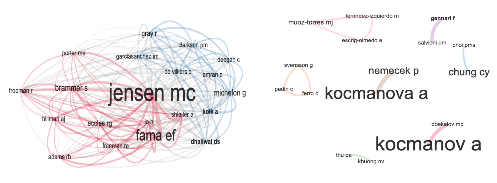 A partir de los documentos base tomados de Scopus, se eligen los diez autores con el mayor índice de citaciones relacionadas con la temática. Los resultados relacionados en la Tabla 3, presentan que Alena Kocmanová es la autora con mayor número de publicaciones, con un total de doce artículos, situación interesante teniendo en cuenta que su incursión en el tema es relativamente nueva. Por otro lado, Zabihollah Rezaee, quien cuenta con más de mil citaciones, tiene el mayor índice H del listado con un resultado de veintidós, sin embargo, es de anotar que esta investigadora no tiene mayor relevancia en el actual estudio, teniendo en cuenta que en sus investigaciones el tema de GC y DS es abordado de una manera superficial.