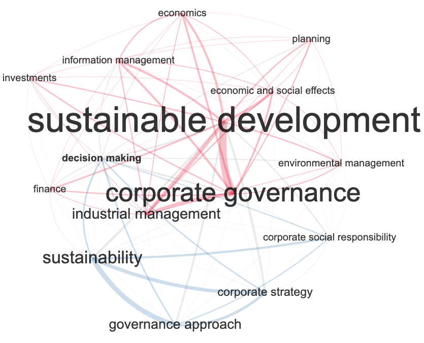 De acuerdo con la Figura 3, esta última red permite identificar la coocurrencia de palabras, la cual arroja dos grandes componentes a partir del tema tratado. El primero, demarcado con color rojo, enlaza el DS y el GC, que son los temas claves de la investigación; y el segundo grupo, demarcado con color azul, conecta la estrategia corporativa, la responsabilidad social corporativa (RSC) y el enfoque de gobernanza, temas abordados a lo largo del artículo.