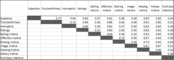 Video tutorial sender motive was also related to centennials’ purchase intention. The motives with the greatest correlation strength were authentic love for the product or brand (motive_affection Ṯ = 0.508 p<0.001), desire to share (motive_sharing Ṯ = 0.477 p<0.001), and desire to help others (motive_helping Ṯ = 0.470 p<0.001). This is consistent with the results of