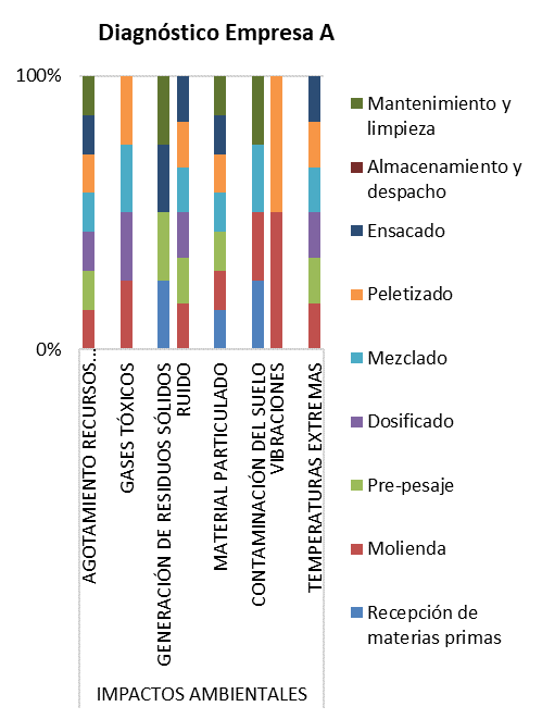La Figura 3 muestra todos los impactos presentes en los procesos productivos de las empresas objeto de estudio. Esta información se estableció durante una jornada laboral de ocho (8) horas y a lo largo de un período de tres (3) meses de observación. Como las empresas tienen actividades y tareas similares, es evidente la presencia de riesgos ambientales y laborales comunes. Estos riesgos incluyen las emisiones atmosféricas, generadas en su mayor parte por partículas procedentes de cada fase del proceso de producción. La exposición a estas partículas puede causar enfermedades crónicas o agudas cuando sus concentraciones superan los umbrales máximos permitidos (