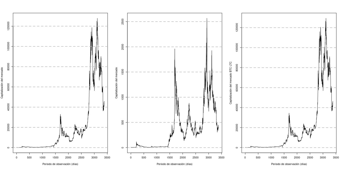 En complemento, las gráficas de la Figura 1 representan la evolución histórica de la capitalización diaria de cierre del mercado de Bitcoin para el periodo de 2013 a 2022 (gráfica de la izquierda), la evolución de la capitalización de mercado de Litcoin se ilustra en la gráfica del medio. La tercera grafica describe el comportamiento histórico de la suma de capitalizaciones de mercado, tanto de Bitcoin, como Litcoin.