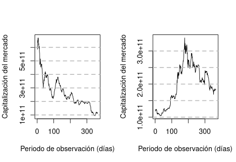 La Figura 2 contiene las gráficas de la evolución en la suma de capitalizaciones del mercado de 2018 (gráfica de la izquierda) y 2019 (gráfica de la derecha).
