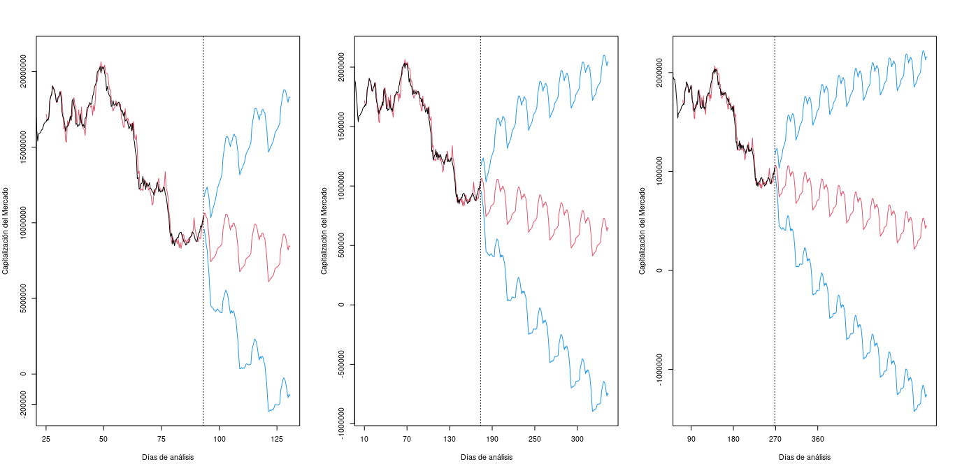 La Figura 3 contiene las gráficas de la evolución en la suma de capitalizaciones del mercado de 2020 (gráfica de la izquierda), 2021 (gráfica del centro) y 2022 (gráfica de la derecha). Los valores de la escala del eje Y de cada gráfica representan millones. En 2020 se observa que cerca de los primeros cincuenta días, la capitalización crecía, luego hubo una corrección hacia abajo, pero a partir de ahí el crecimiento fue constante durante todo el año. En 2021, durante un periodo cercano a cien días, la línea de tendencia fue al alza con una profunda corrección hasta cerca del día 200. En seguida, la capitalización siguió creciendo para cerrar el año con una notoria tendencia alcista. En 2022 se observa una clara tendencia a la baja, aunque al final del periodo en estudio parece haber una corrección.