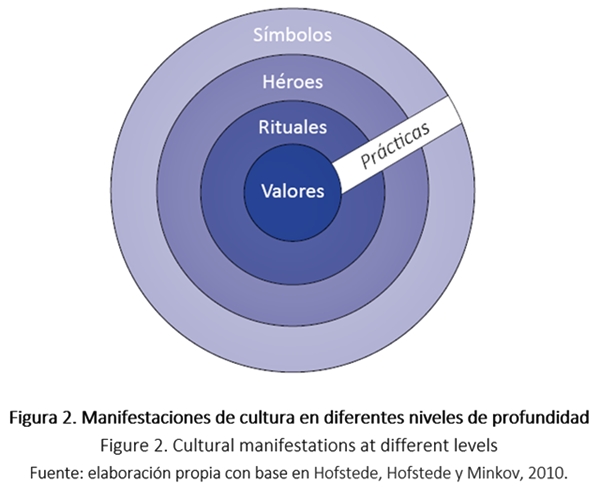 Este tipo de manifestación se desarrolla continuamente, así que nuevos símbolos aparecen, mientras que otros desaparecen o se imitan de otras culturas. Por tal razón, los símbolos se encuentran en el nivel más superficial. Los héroes representan personas vivas o muertas las cuales poseen características altamente apreciadas y que funcionan como un modelo a seguir. Por un lado, superfluos para el alcance de objetivos, sin embargo, los rituales se consideran socialmente esenciales. Se llevan a cabo por su propio bien, como ejemplo se puede mencionar: maneras de saludar, ceremonias religiosas o sociales. No obstante que el significado cultural de las tres manifestaciones mencionadas es invisible, estas tienen en común la visibilidad para extraños, ilustrado en la Figura 2 por el término prácticas. En el centro se encuentran los valores, los cuales representan tendencias de preferencia de ciertos estados de cosas sobre otras. Los valores están reflejados en sentimientos contradictorios, como lo racional e irracional o lo moral e inmoral.
