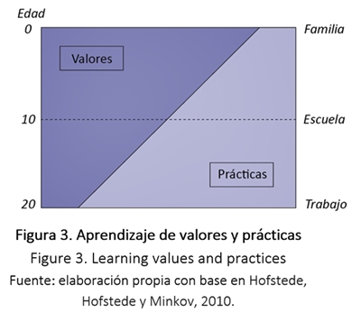 La Figura 3 muestra la adquisición de los valores y prácticas durante la vida. Mientras que los valores son adquiridos temprano y principalmente por parte de la familia, las prácticas se obtienen más tarde y sobre todo en relación con el trabajo. Clarificando un poco más en una etapa de 10 a 12 años, en la cual el ser humano posee una alta capacidad de absorción, se impregnan símbolos, héroes, rituales y los valores básicos. Al final de dicho periodo, el aprendizaje cambia de tal manera, que es más consciente y se enfoca en nuevas prácticas.