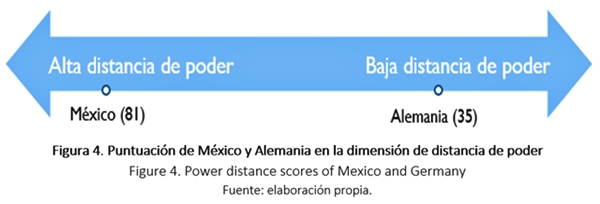 La primera dimensión que se analizó fue la de distancia de poder. México obtuvo el 10 y 11 lugar con un índice de 81, y Alemania del 65 al 67 lugar con un índice de 35, de 76 países en total. Mientras que México muestra valores altos en esta dimensión, Alemania muestra valores bajos.