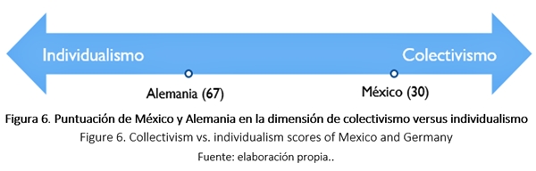En cuanto a la dimensión de colectivismo versus individualismo, se puede observar una gran brecha entre Alemania en el 19 lugar con un índice de 67 y México en el 48 y 50 lugar con un índice de 30, de un total de 76 países. Esto significa que mientras que en México prevale el colectivismo, en Alemania domina el individualismo.