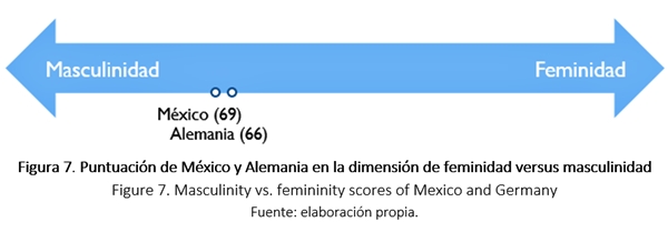 Así es que las culturas de los dos países se pueden considerar como masculinas. La diferencia entre los índices de México y Alemania es muy pequeña. Este hecho puede favorecer la colaboración, de tal manera que los empleados sigan los mismos valores. Cuando se trata de la resolución de problemas, el enfoque en resultados o la recompensa según la equidad, los individuos comparten la misma comprensión. La gente de las dos culturas tiene la misma apreciación en cuanto a la alta prioridad del trabajo en la vida y el menosprecio del tiempo libre. La asertividad, la ambición y la competencia representan valores importantes en las culturas marcadas por la masculinidad.