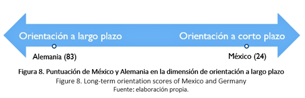 En la dimensión de orientación a largo plazo, Alemania se encuentra en el sexto lugar con un índice de 83 y México en el 74 y 76 lugar, con un índice de 24 en un rango de 0 a 100, en donde 0 representa la orientación a corto plazo y 100 a largo plazo.