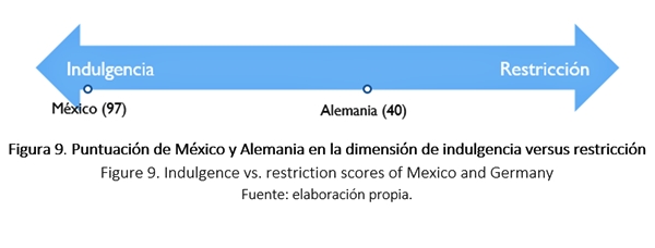 En la dimensión de indulgencia versus restricción, México está posicionado en el segundo lugar con un índice de 97 después de Venezuela, y Alemania se encuentra en medio, en el 52 y 53 lugar, con un índice de 40 de un total de 93 países y regiones que participaron en el WVS. Donde 0 (cero) representa a los países con más restricción y 100 (cien) los países con más indulgencia.