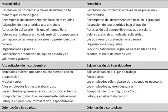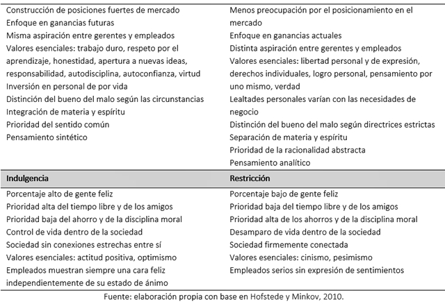 Posteriormente al descubrimiento y análisis de las cuatro dimensiones mencionadas, Minkov desarrolló otras dos categorías que complementan el modelo de Hofstede: 5) orientación a largo plazo versus orientación a corto plazo; y 6) indulgencia versus restricción. En la Tabla 1 se describen las seis dimensiones (Hofstede, Hofstede and Minkov, 2010).