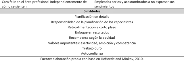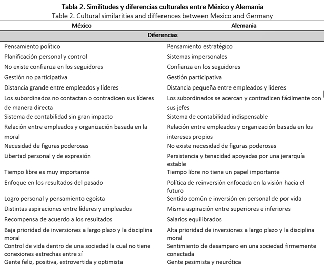 La Tabla 2 representa un resumen de las diferencias culturales entre México y Alemania, así como de las similitudes al final de la tabla, de acuerdo con la propuesta de Hofstede.